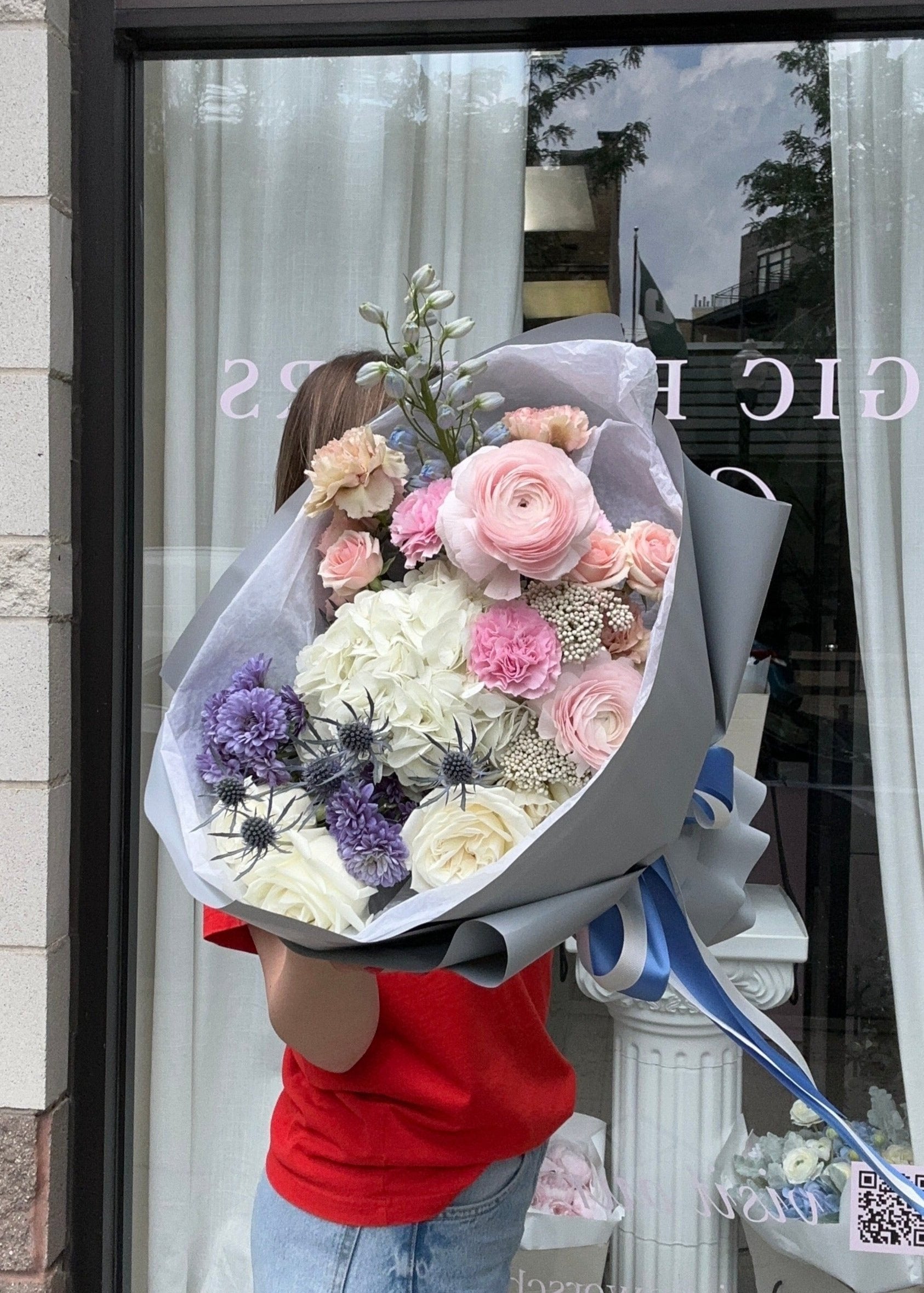 A whimsical fusion of soft romance and cool serenity, our “Blue Sand” bouquet is a floral daydream wrapped in sophisticated grey paper and finished with a luxe double satin ribbon in shades of sky. This design blends timeless florals with bold texture, making it perfect for any occasion.