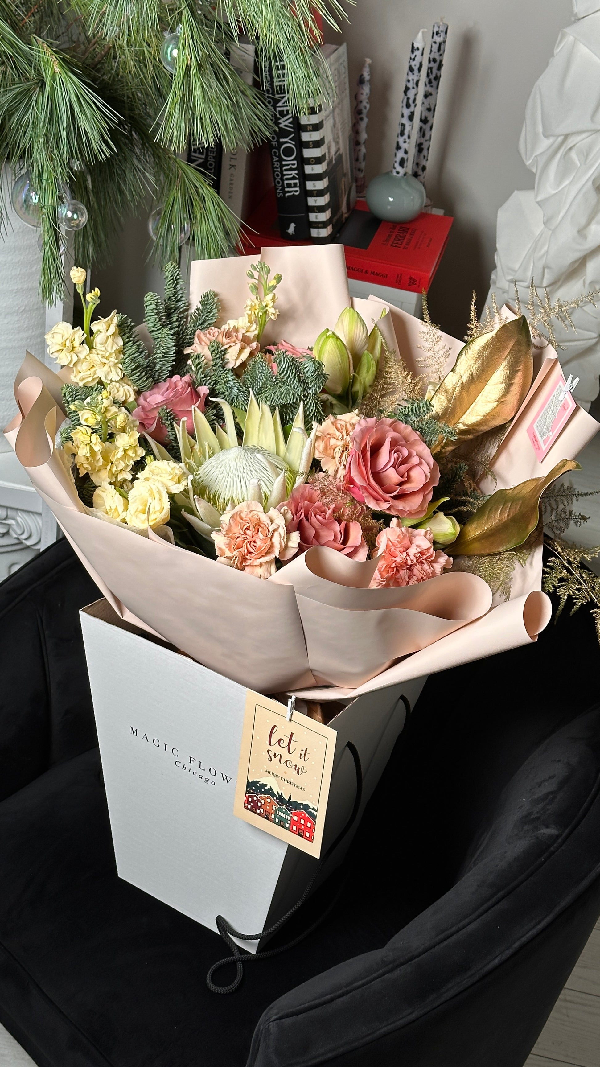 This fresh bouquet is filled with: Carnations, Roses, Stock, Lizianthus, Amaryllis, Greenery.