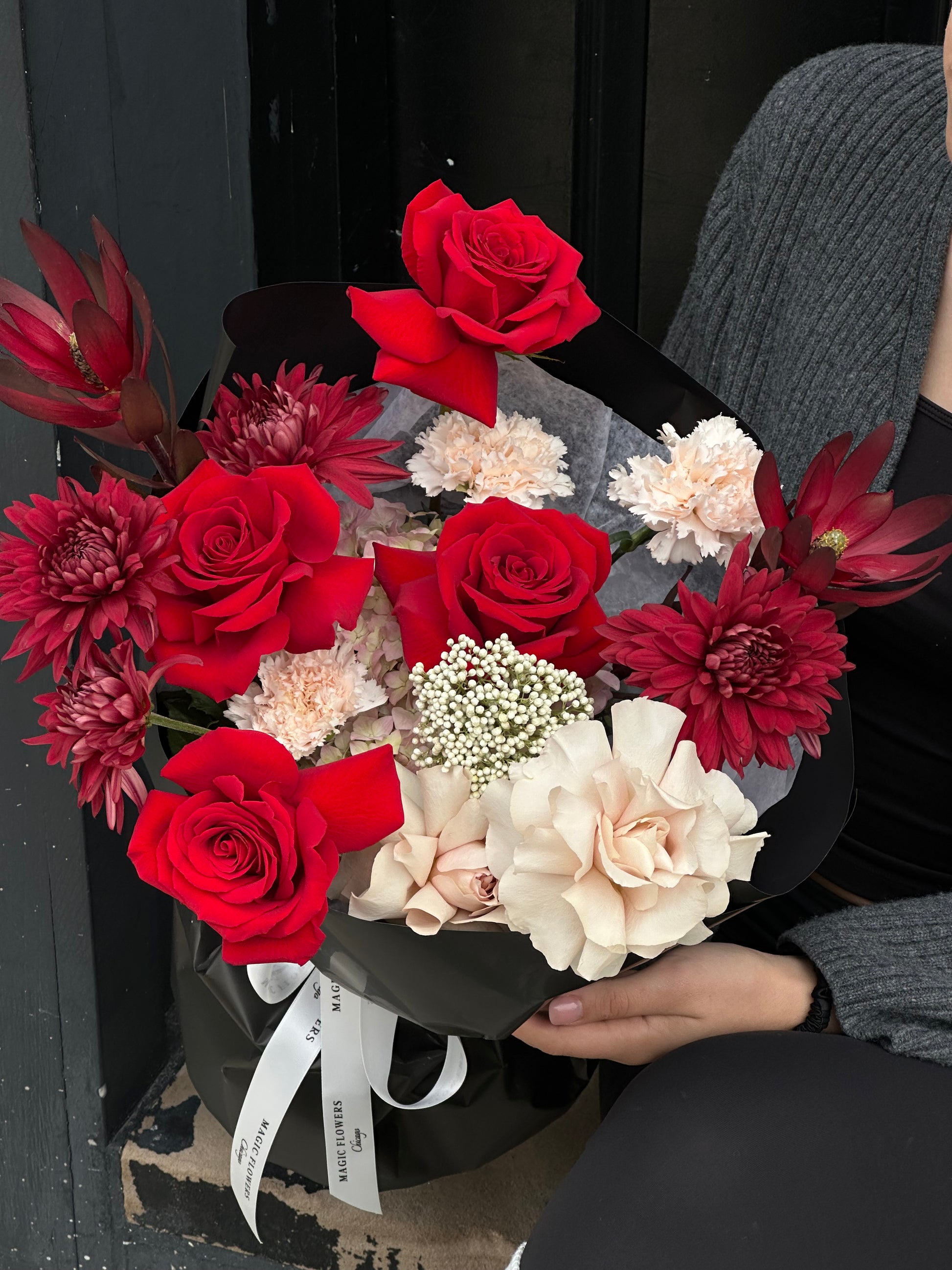 Designed in our signature style, this bouquet features bold red roses, warm-toned chrysanthemums, red roses, creamy carnations, and delicate blush accents, all artfully arranged in sleek black wrapping with luxury ribbons.