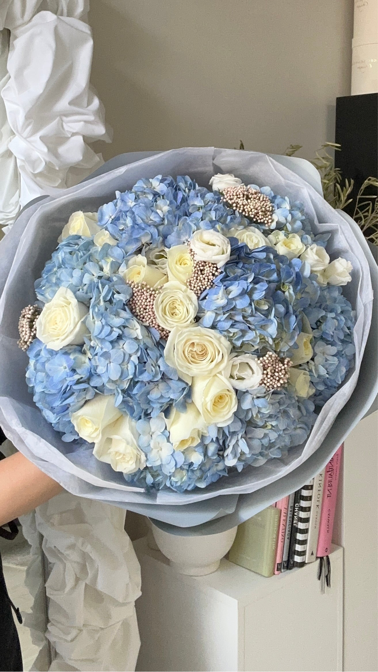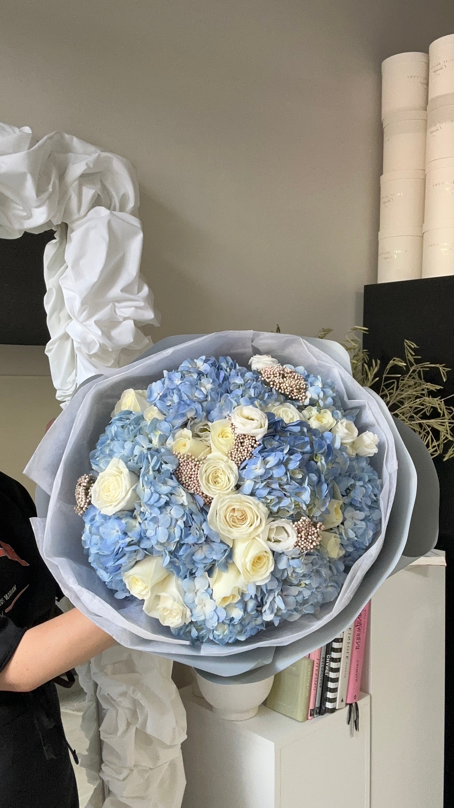 Soft, serene, and effortlessly chic — the Morning in Paris bouquet captures the quiet beauty of a Parisian sunrise. This luxurious design features lush blue hydrangeas paired with creamy ivory roses and elegant pearl-textured accents, hand-wrapped in layers of cool-toned designer paper.