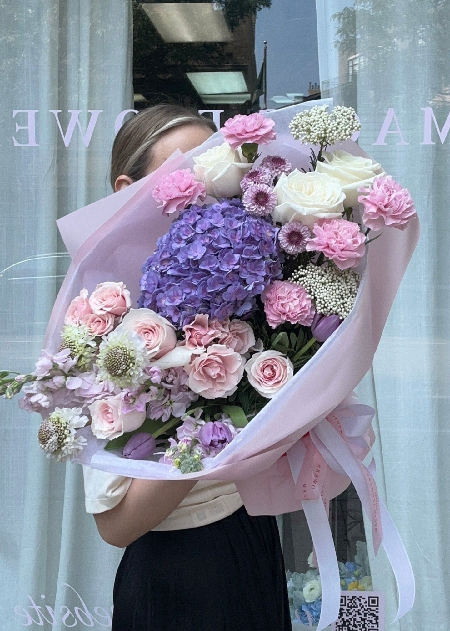 Flower Composition: Purple Hydrangea, Cream and Blush Ecuadorian Roses, Pink Carnations, Lavender Stock, Spray Roses.