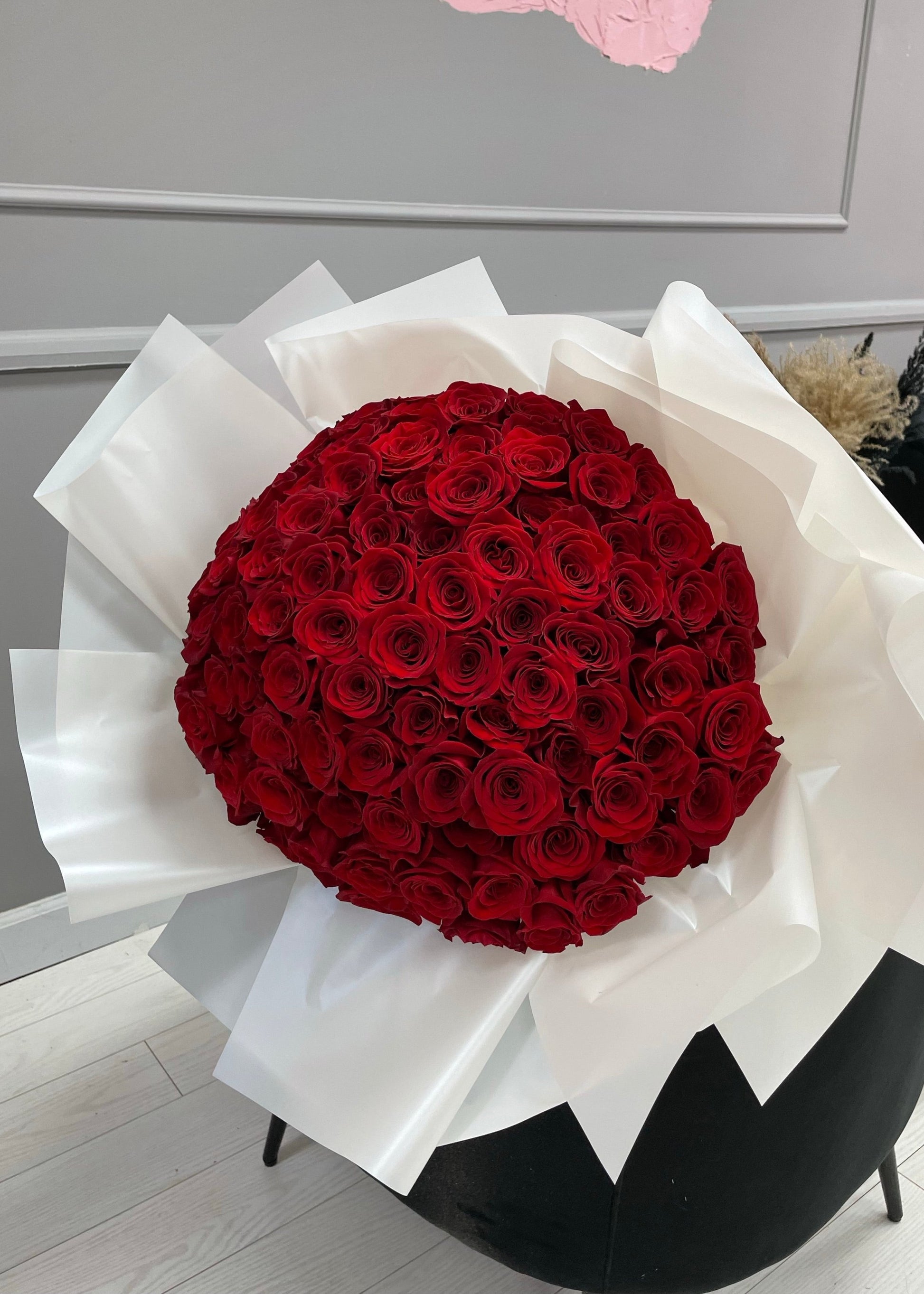 Turn moments into memories with this breathtaking bouquet of 100 luxurious long stem roses — an opulent gesture that speaks louder than words. Whether you're celebrating love, passion, or a milestone moment, this grand composition leaves a lasting impression.