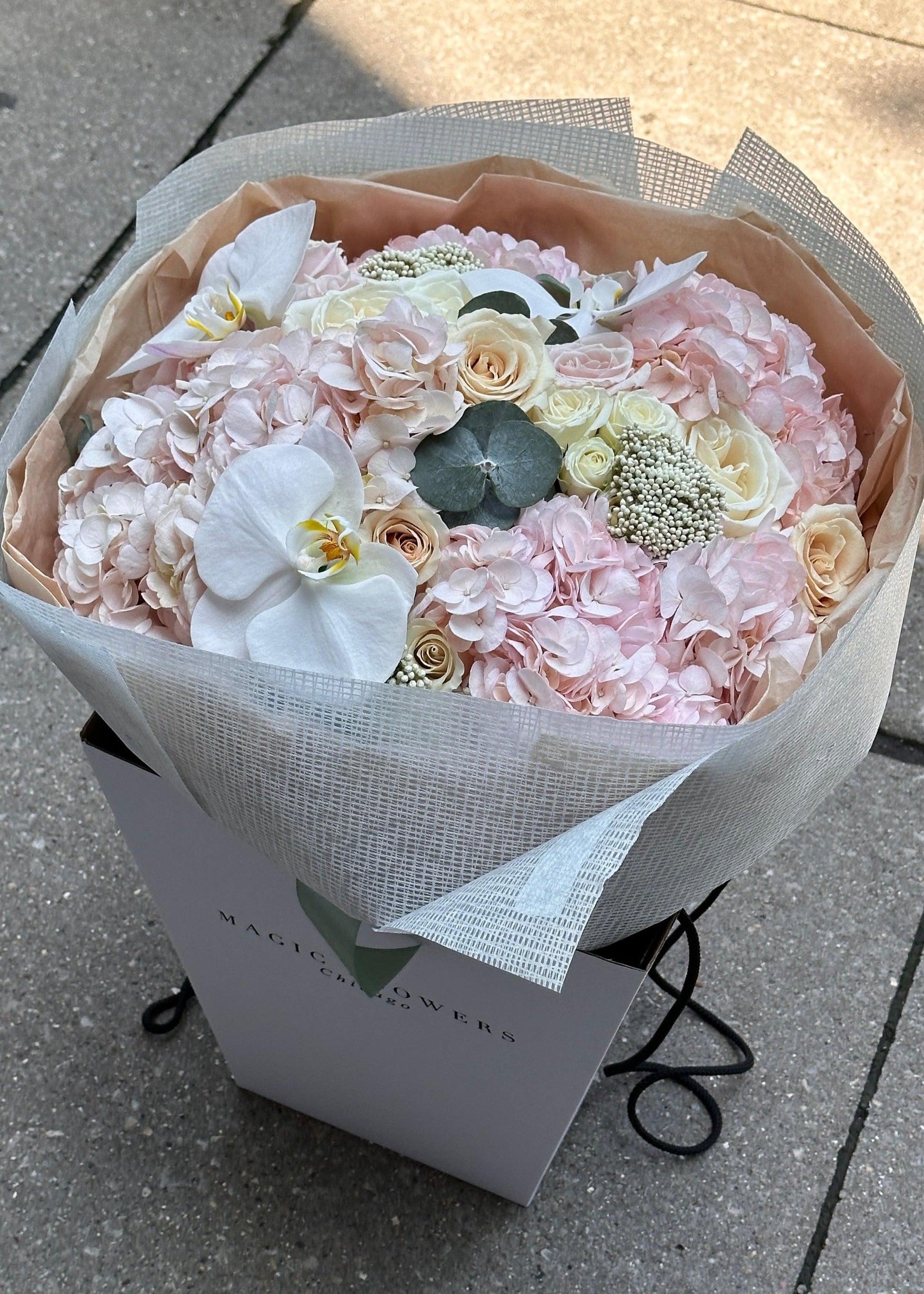 A true statement of graceful beauty, the “Pink Iceberg” bouquet blends soft tones and premium textures into a refined floral masterpiece. Designed for those who appreciate subtle luxury and timeless elegance, this arrangement makes the perfect gift for weddings, birthdays, baby showers, or romantic gestures.