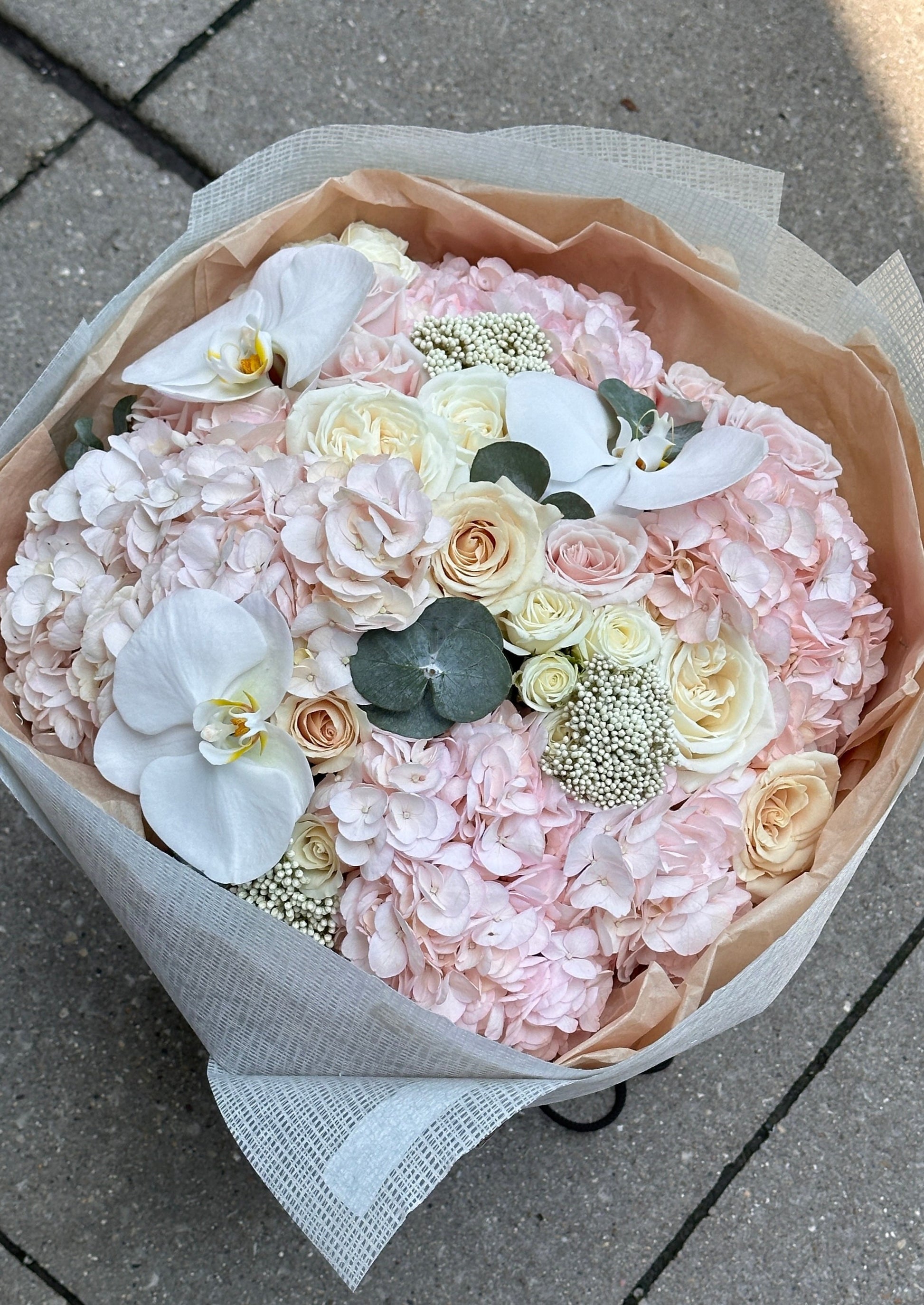 Blush Pink Hydrangeas, Creamy Vendela Roses, Champagne Spray Roses, White Phalenopsis Orchids, Rice Flowers, Eucalypthus.