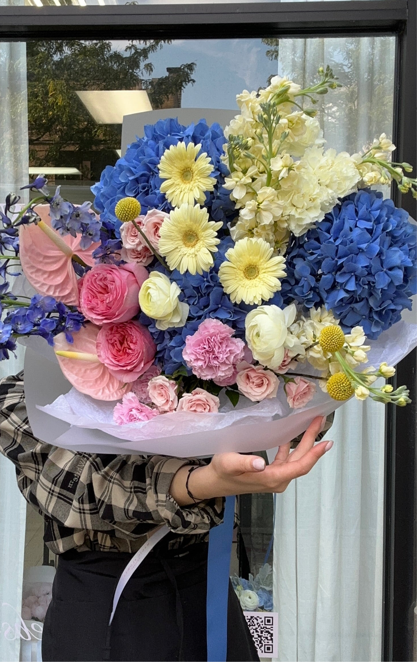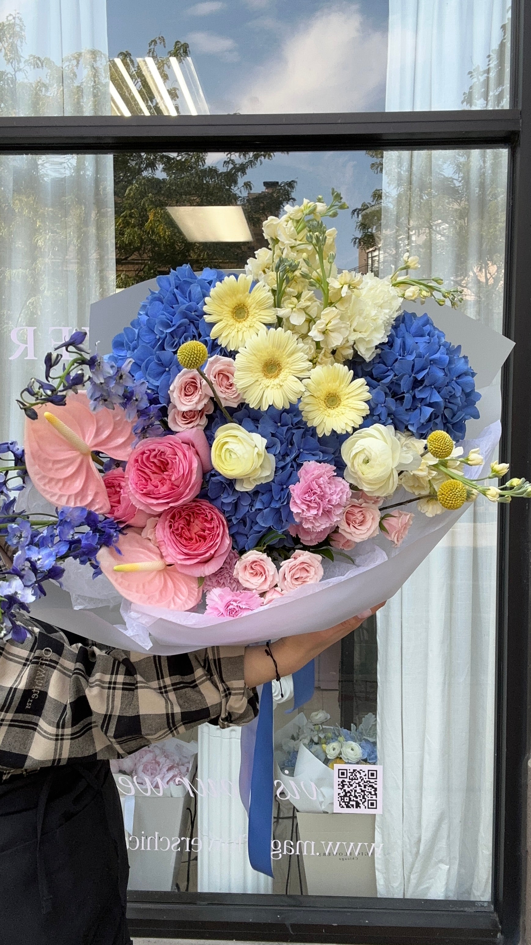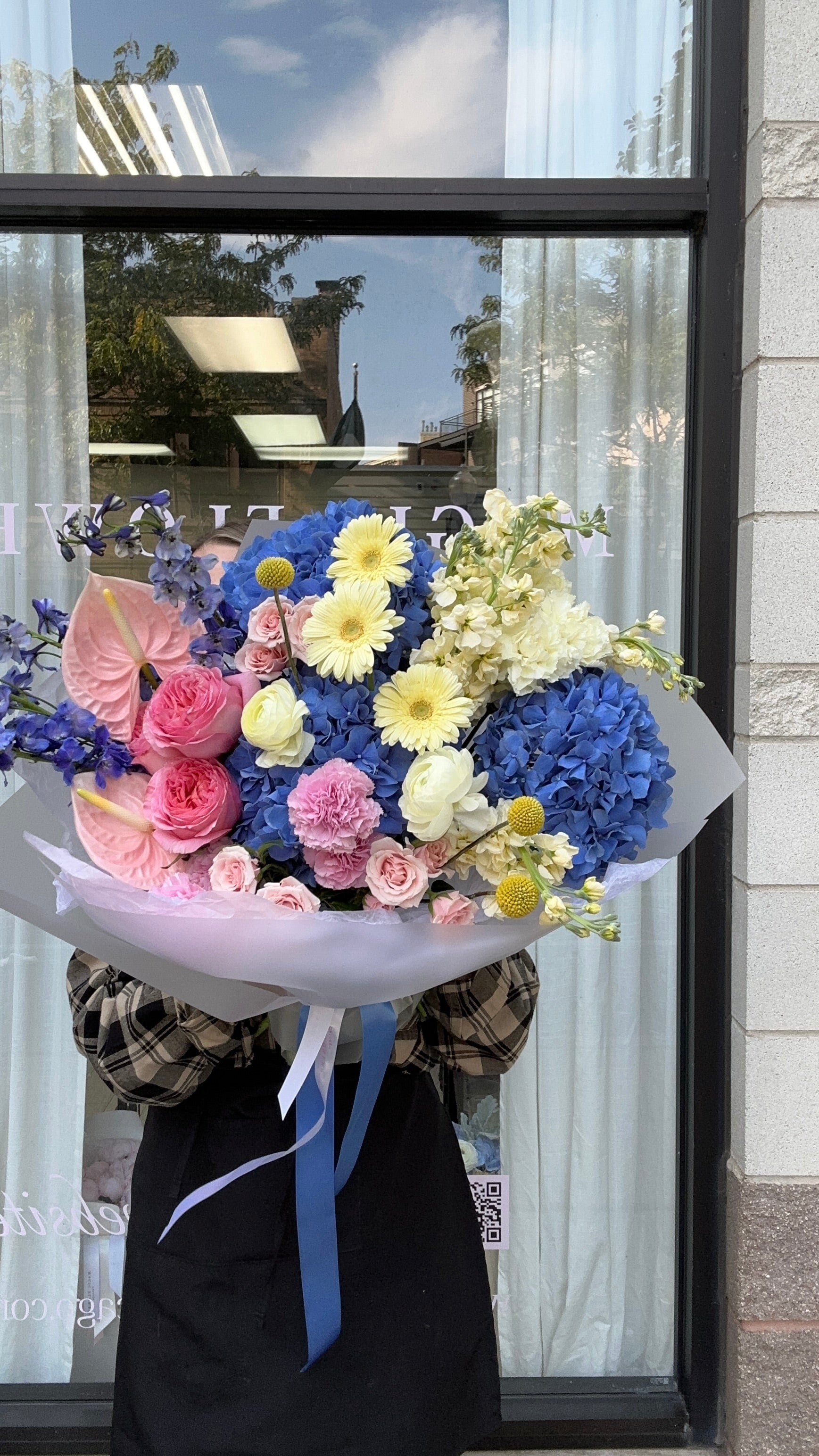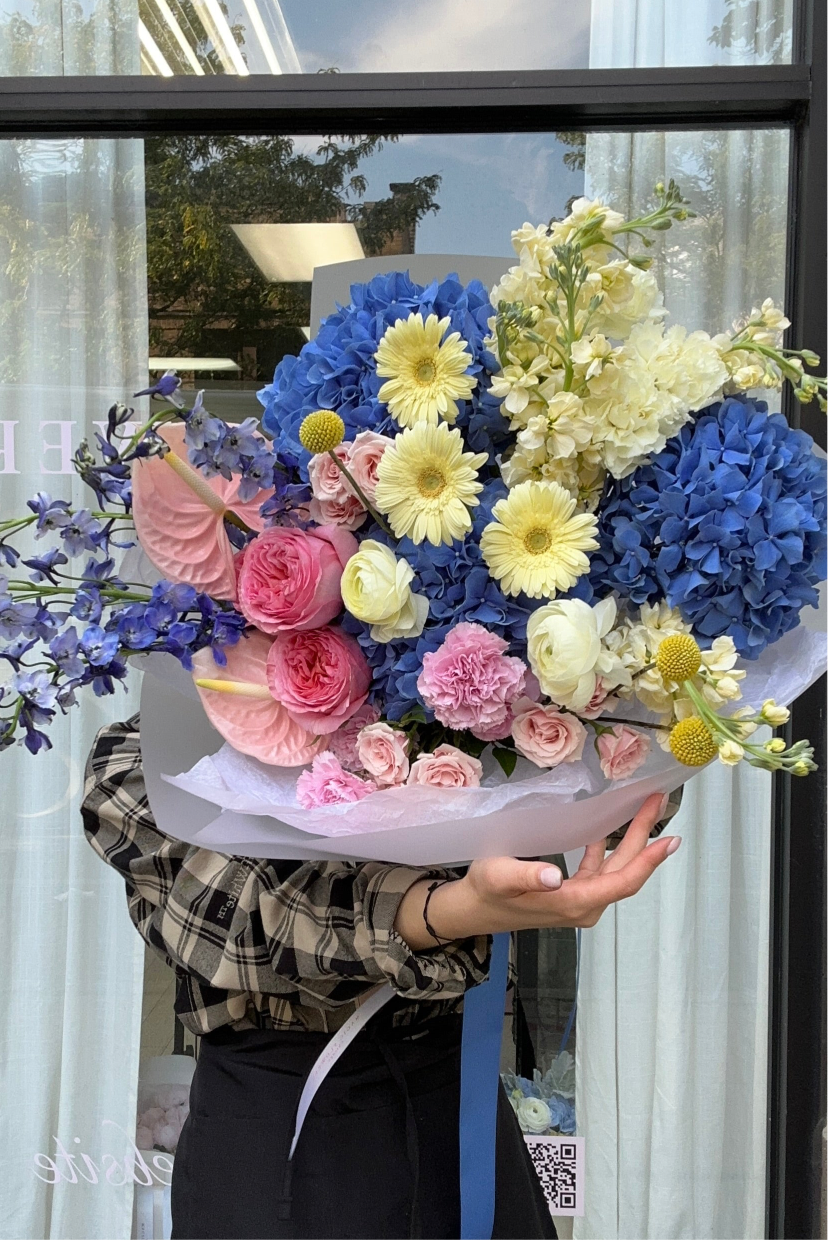 Fresh, bold, and full of joy — the Summertime bouquet is a playful explosion of seasonal color. Featuring vivid blue hydrangeas, yellow gerberas, delphinium, blush spray roses, pink garden roses, ranunculus, and anthurium, this oversized bouquet is a celebration in bloom. Designed in a loose, airy garden style, it brings a radiant burst of summer to any room or occasion.
