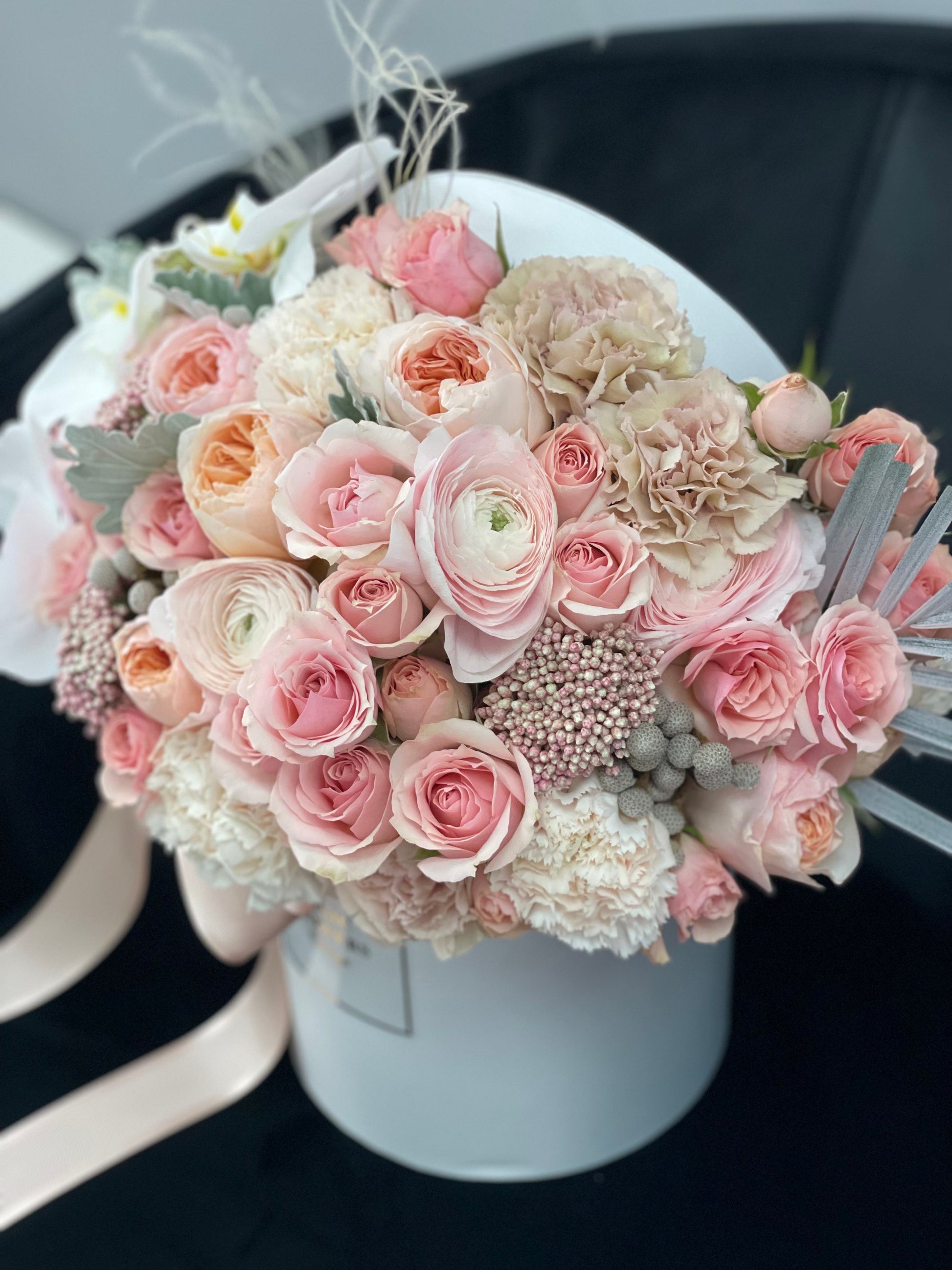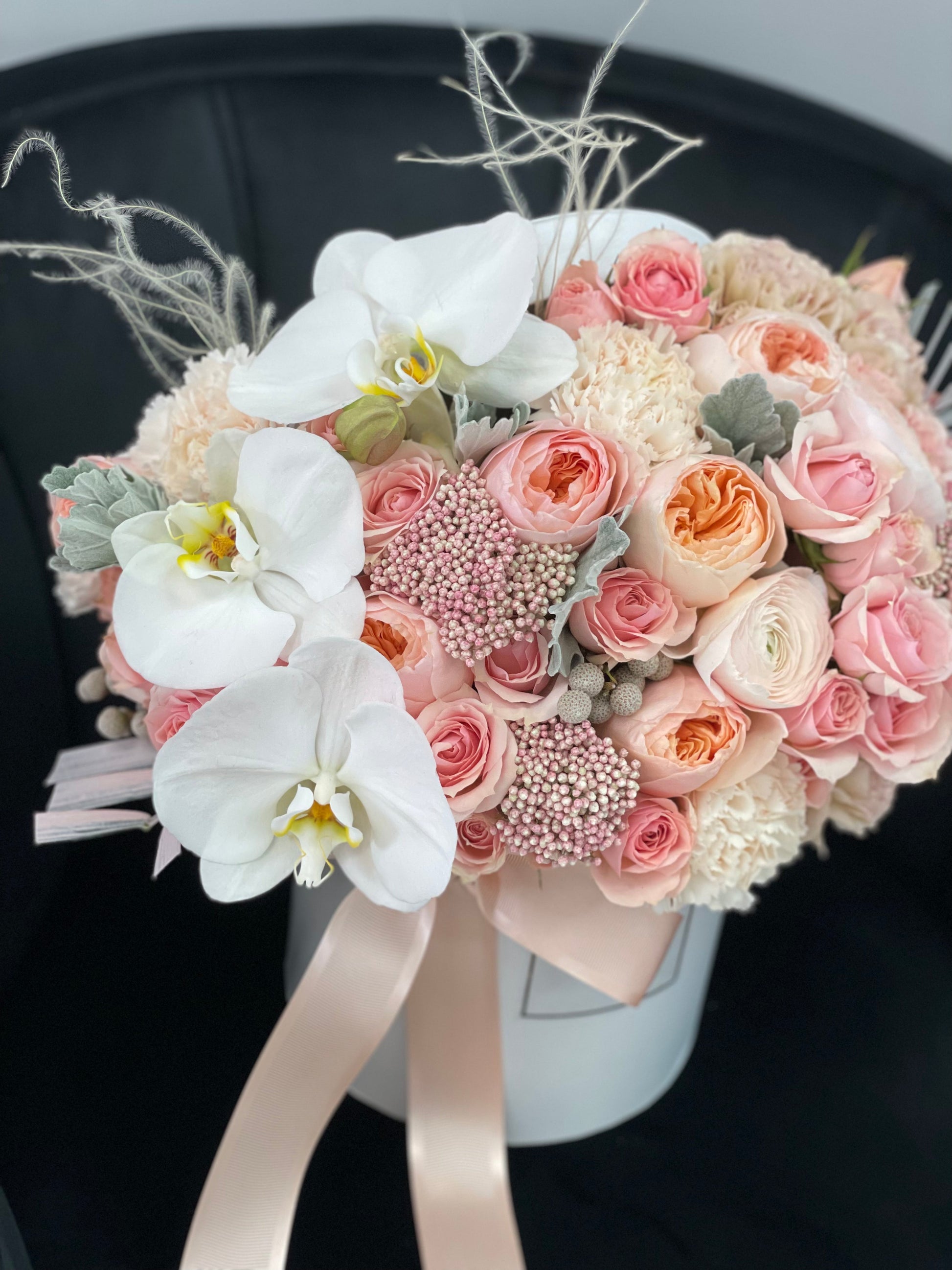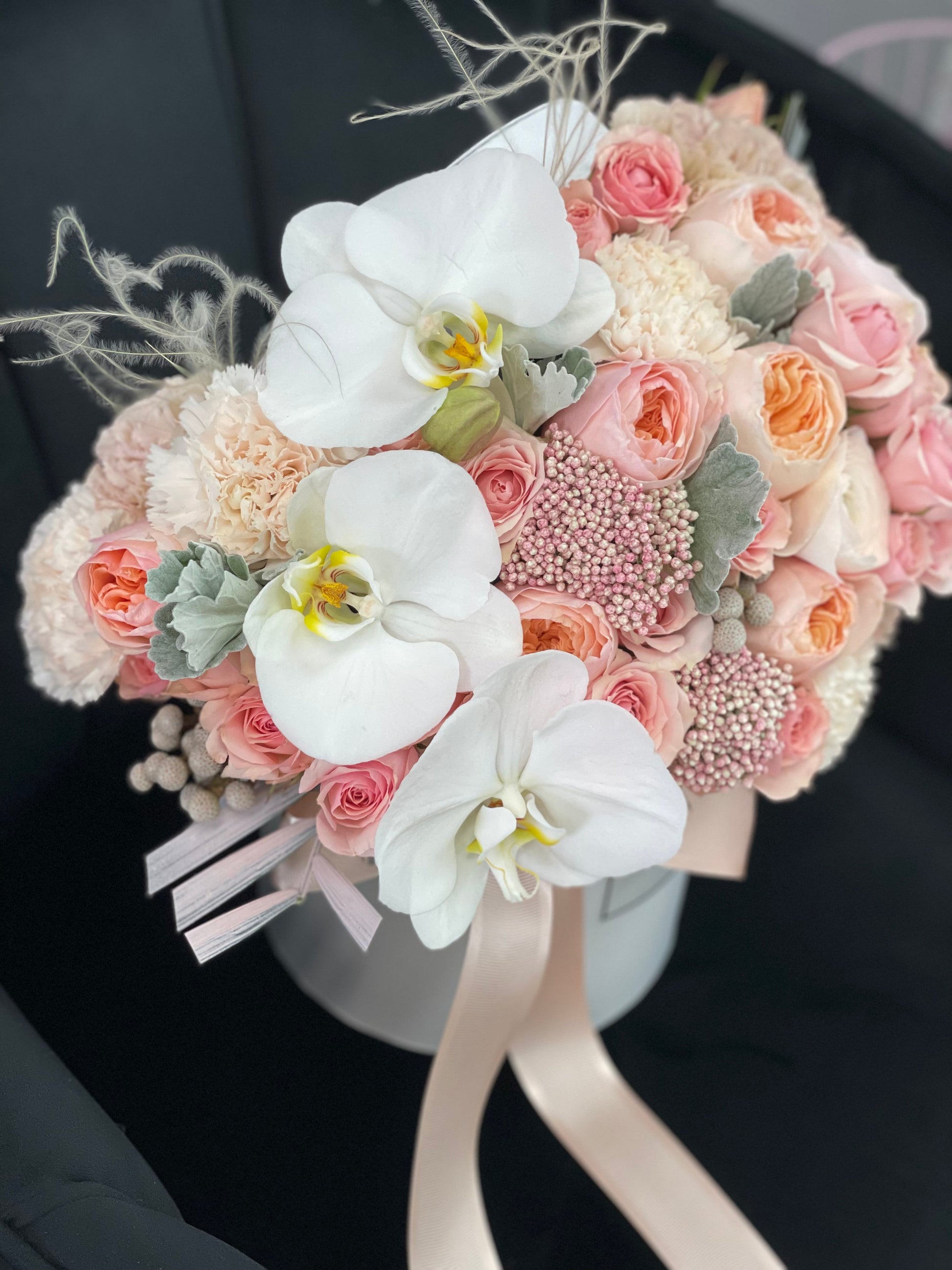 This fresh bouquet is filled with: Garden Roses, Carnation, Dusty Miller, Rice Flowers, Orchids, Brunia, Ranunculus.