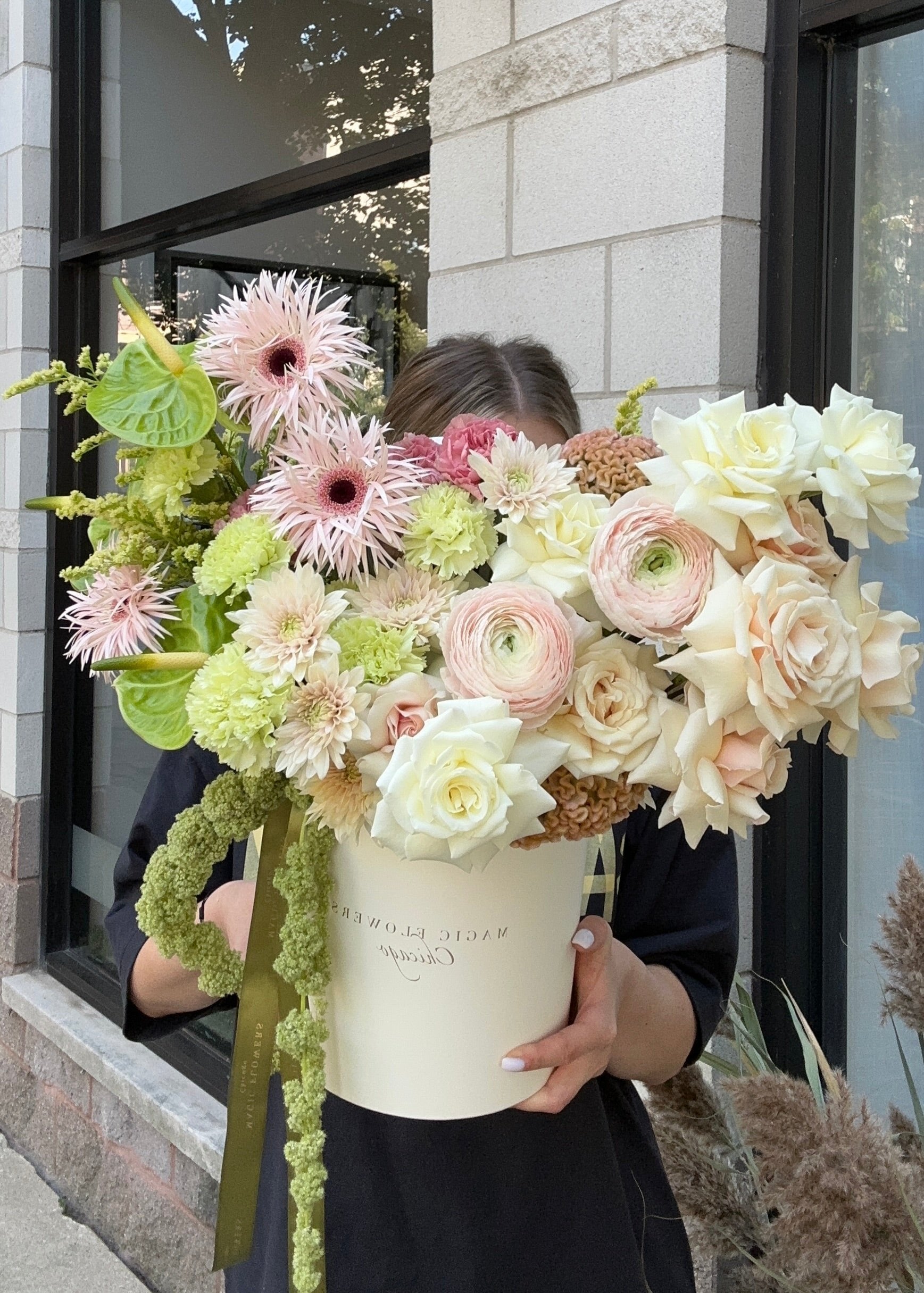 This sophisticated box features a harmonious blend of premium blooms in gentle blush, cream, lime, and soft peach tones. Each flower is thoughtfully selected and styled to create an elegant, airy, and garden-fresh look perfect for birthdays, anniversaries, baby showers, or simply as a gift of love and appreciation.