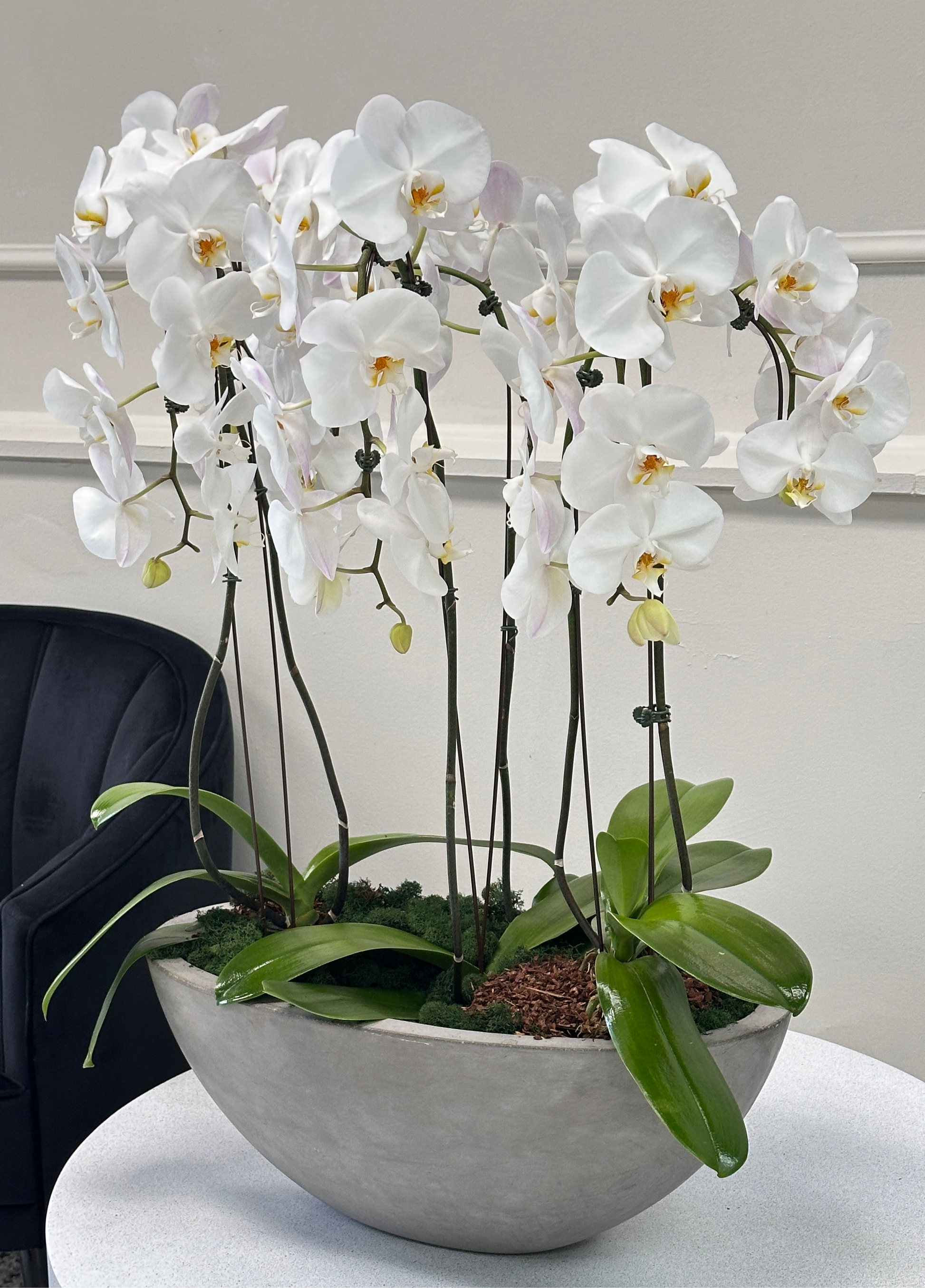 Our Deluxe White Orchid Planter is the ultimate expression of modern elegance. Designed with multiple tall stems of pristine white Phalaenopsis orchids, this premium arrangement is styled in a sleek ceramic bowl and accented with lush moss for a refined, natural finish.