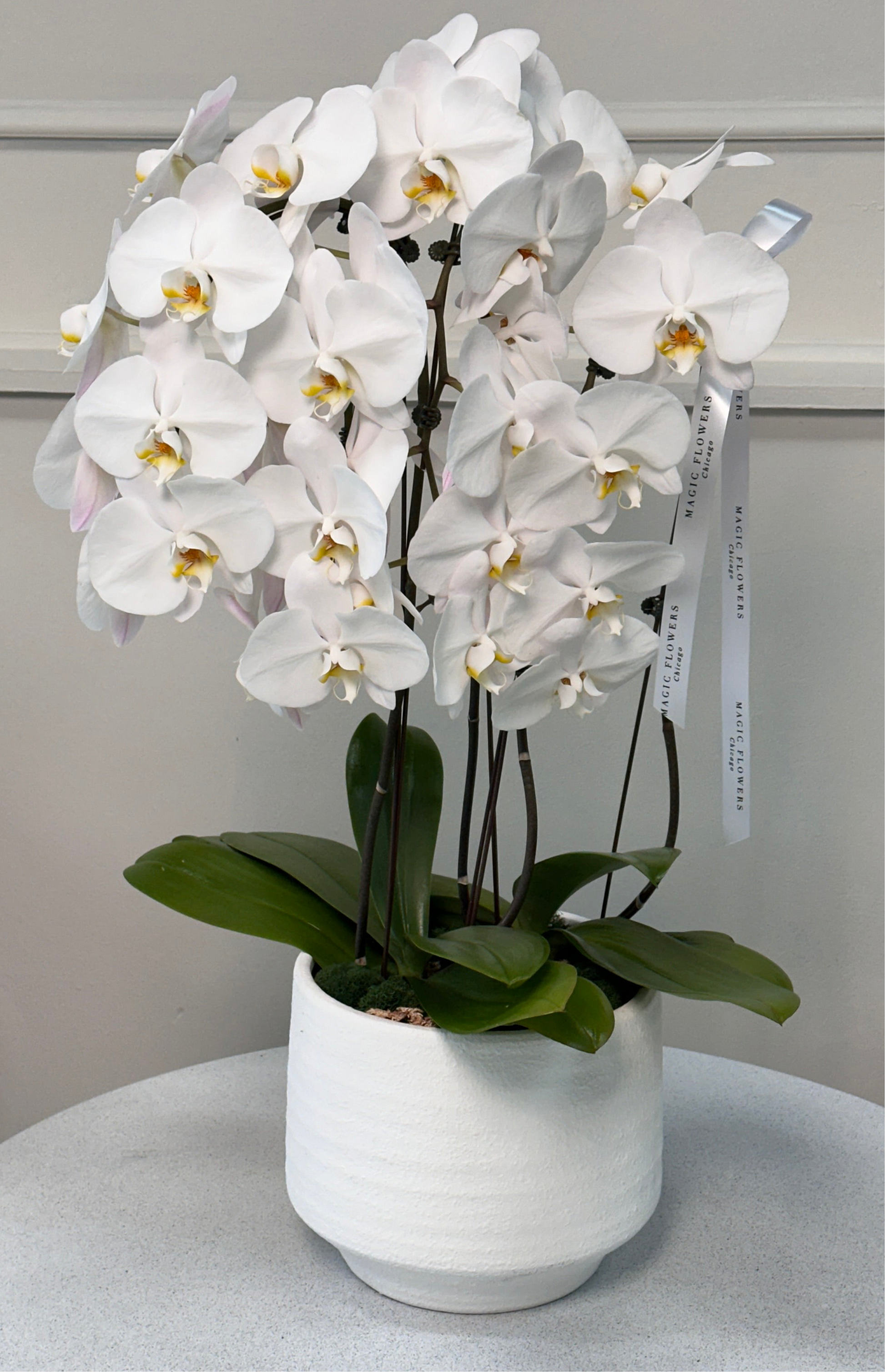 Our Deluxe White Orchid Planter is the ultimate expression of modern elegance. Designed with multiple tall stems of pristine white Phalaenopsis orchids, this premium arrangement is styled in a sleek ceramic bowl and accented with lush moss for a refined, natural finish.