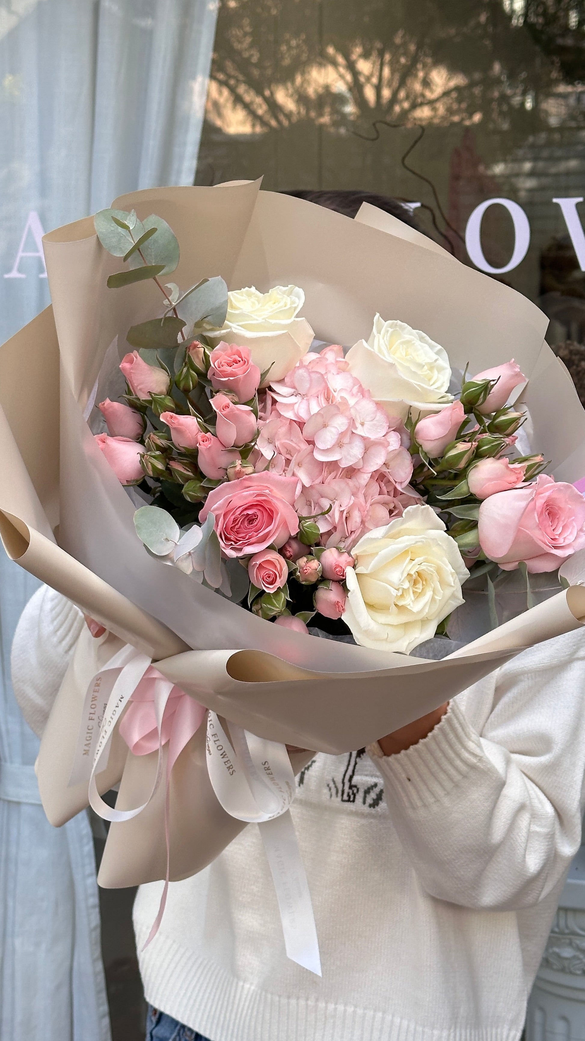 This fresh bouquet is filled with: Tulips, Roses, Hydrangea, Lizianthus, Spray Roses.